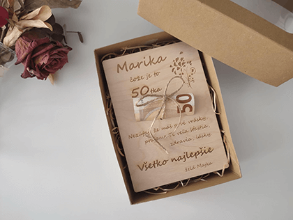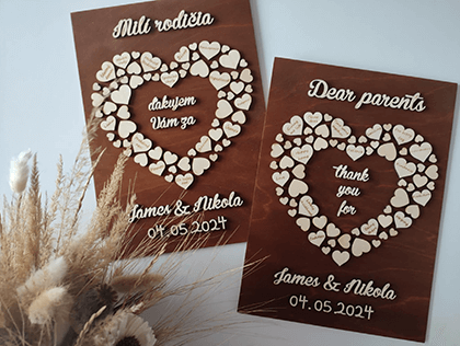 Hľadáte skvelý darček, jedinečné doplnky na svadbu či praktický a dizajnový kúsok do domácnosti? Potešte svoje oči a nahliadnite do našej ponuky. Veríme, že milovníci dreva a kvality si u nás nájdu štýlový doplnok či originálny darček.