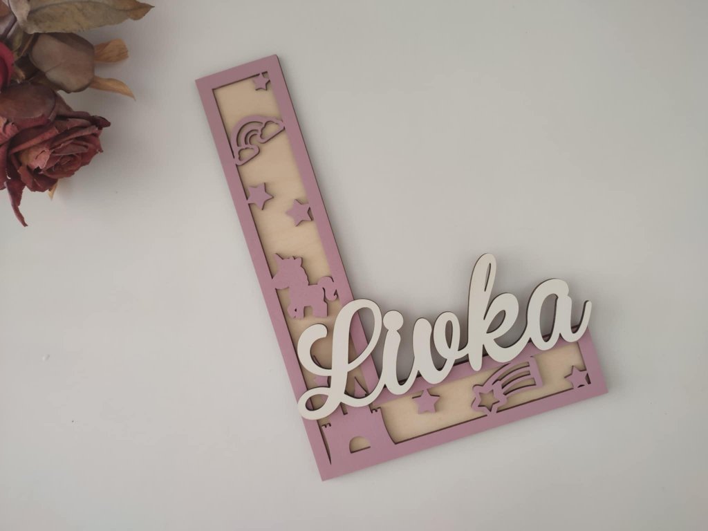 Písmenko sa skladá z troch vrstiev - plná podkladová vrstva, na ktorej je nalepená vyrezávaná vrstva s obľúbeným motívom, na ktorej je nalepené meno Vášho dieťatka.