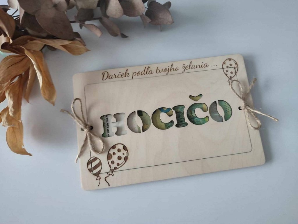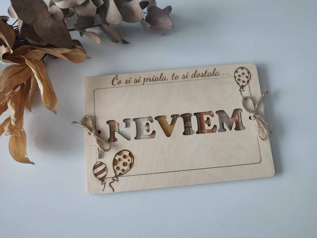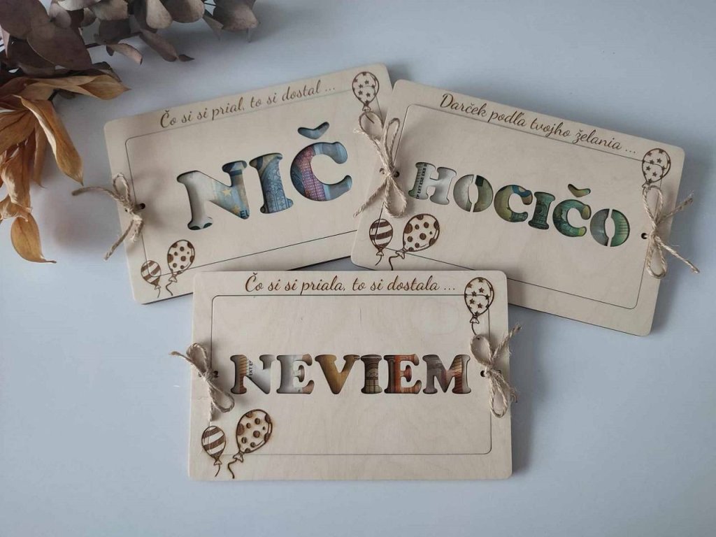Tak to oslávencovi splňte. Drevená obálka na peniaze s vyrezávaným textom je jednoduché a vtipné riešenie ako si nelámať hlavu nad darčekom a venovať to najužitočnejšie – peniaze.