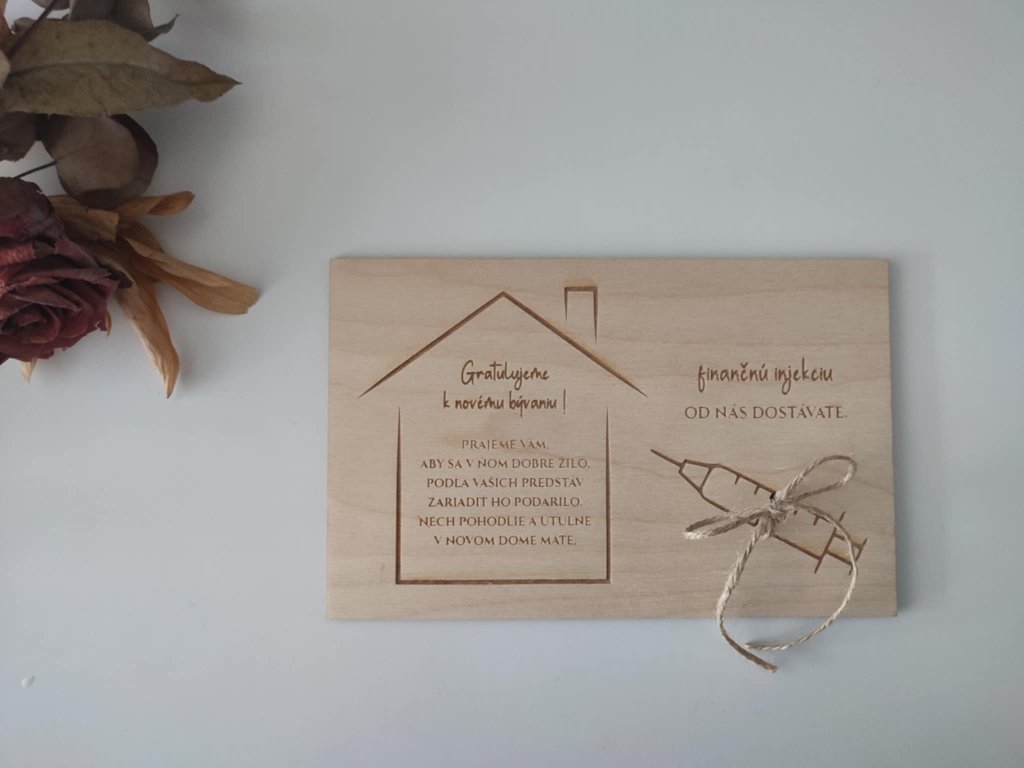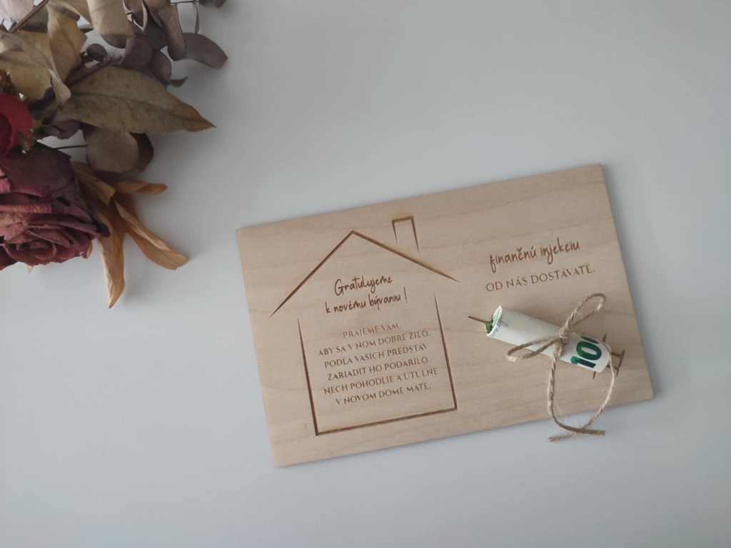 Hľadáš originálny spôsob, ako pogratulovať k novému bývaniu a zároveň potešiť nových majiteľov? Drevená tabuľka s milým odkazom a miestom na pripnutie bankovky - finančnou injekciou je ten správny darček, ktorý rozosmeje aj poteší každého, kto si zariaďuje svoje vysnívané bývanie. A navyše ostane ako krásna spomienka na začiatok novej kapitoly.