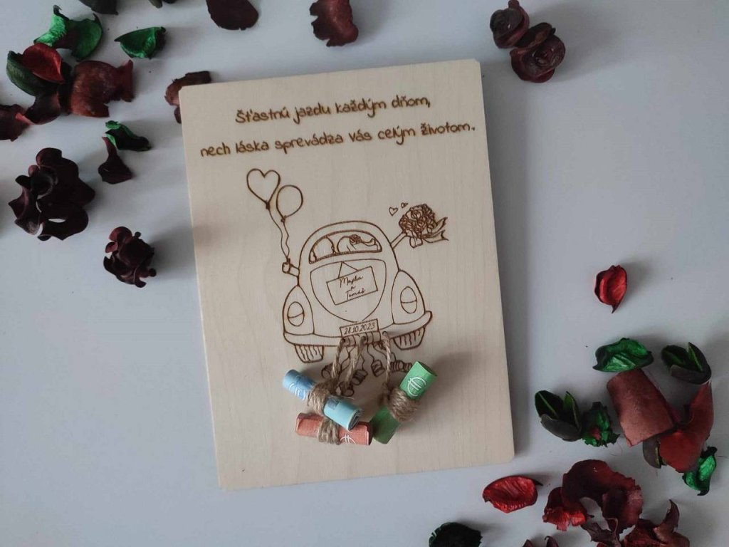 Drevená gratulačná tabuľka pre novomanželov s originálnym venovaním a motívom auta s plechovkami je pekný a nápaditý spôsob ako si nelámať hlavu nad svadobným darom a venovať novomanželom to najužitočnejšie - peniaze.
