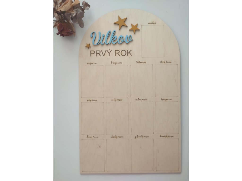 Na tabuľke nájdeš miesto na fotku (9 x 13 cm) ku každému mesiacu a tiež na prvú fotku – narodenie. Zo zadnej strany obojstranná penová páska na prichytenie na stenu, prípadne možné vyrobiť s háčikom na zavesenie.
