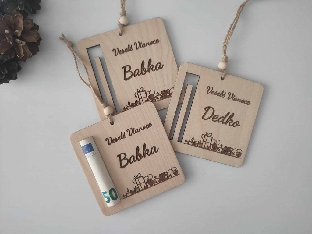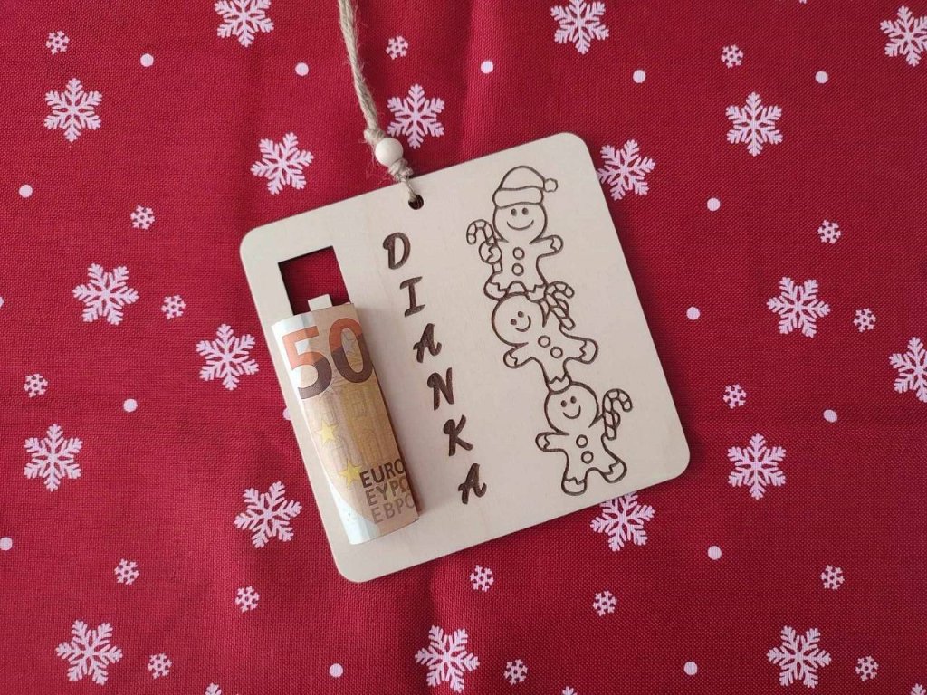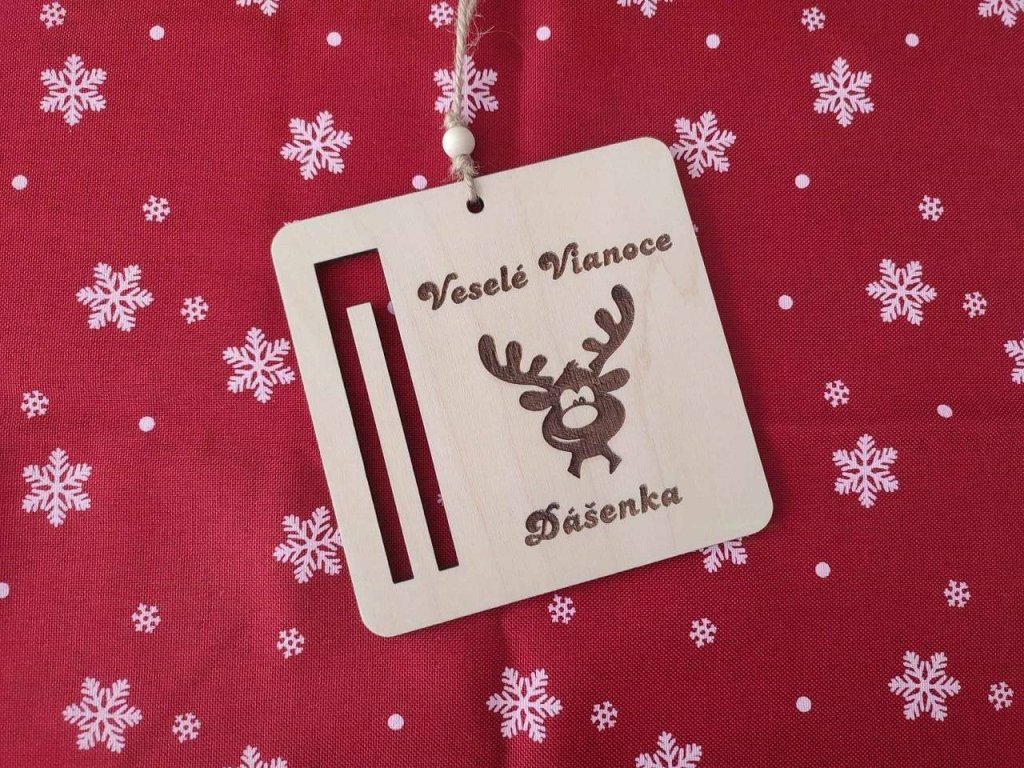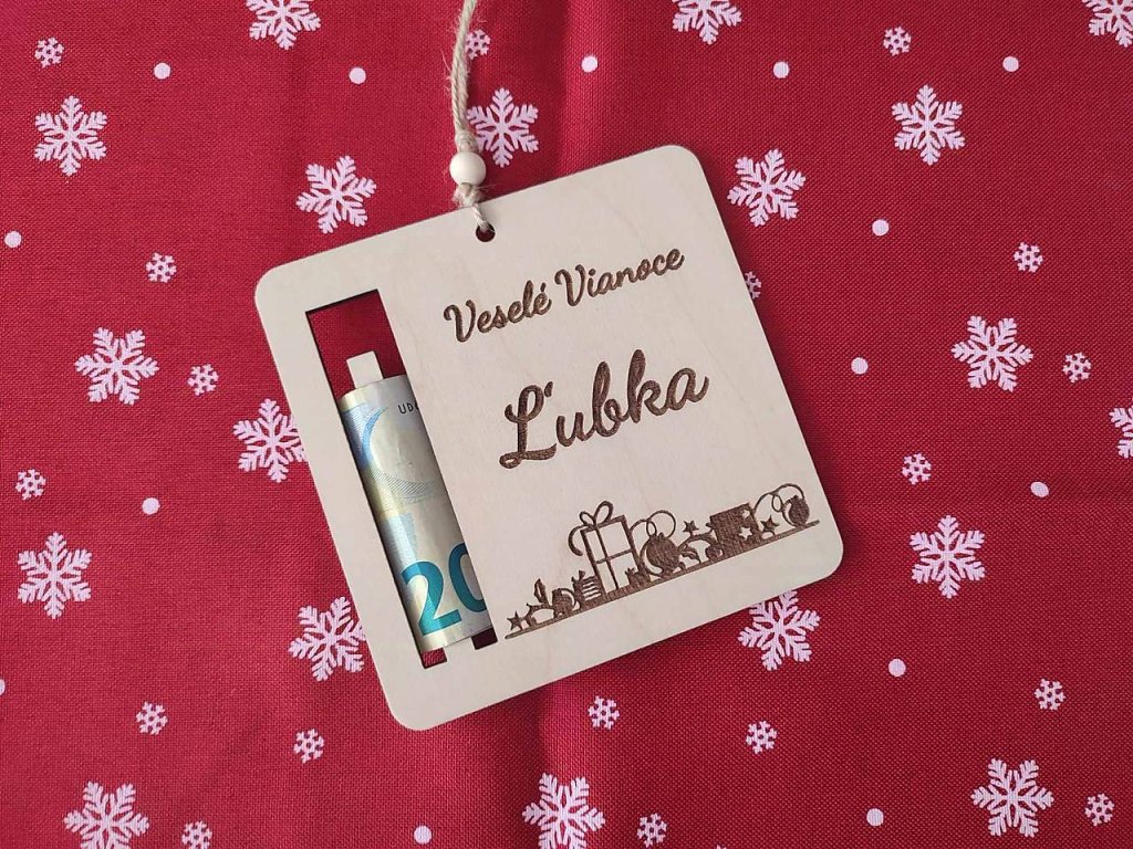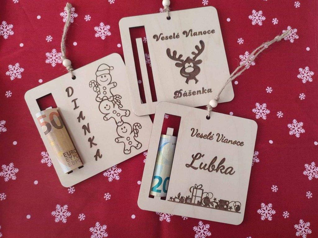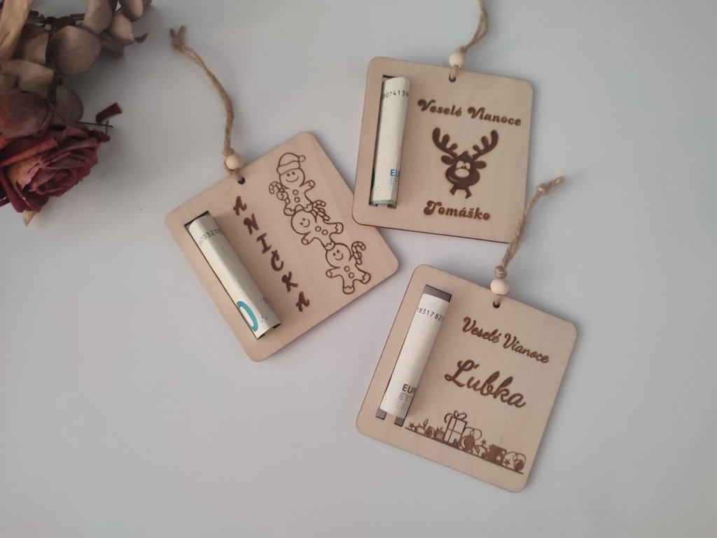 Závesná tabuľka s menom a vianočným motívom na darovanie peňazí, ktorú môžete zavesiť napríklad na vianočný stromček je jednoduché riešenie ako si nelámať hlavu nad darčekom a venovať to najužitočnejšie - peniaze. Tabuľka je dostupná v troch vianočných motívoch - sob, pernícky a darčeky.