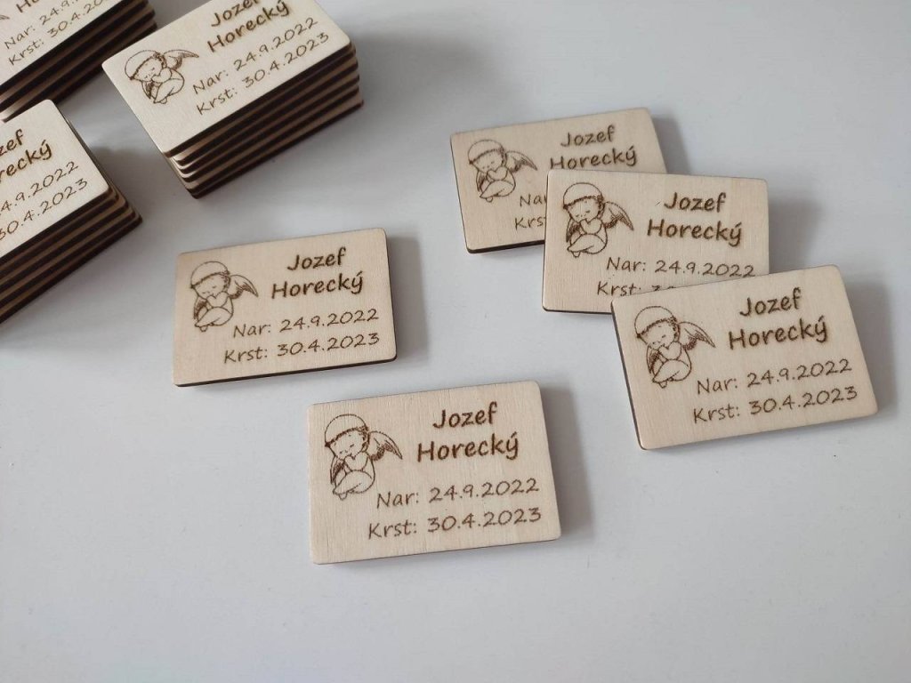 Aj maličkosť poteší :) Drevená magnetka na krstiny dieťatka pripravená podľa Vášho želania - milá pozornosť pre Vašich hostí na pamiatku na narodenie Vášho drobčeka.