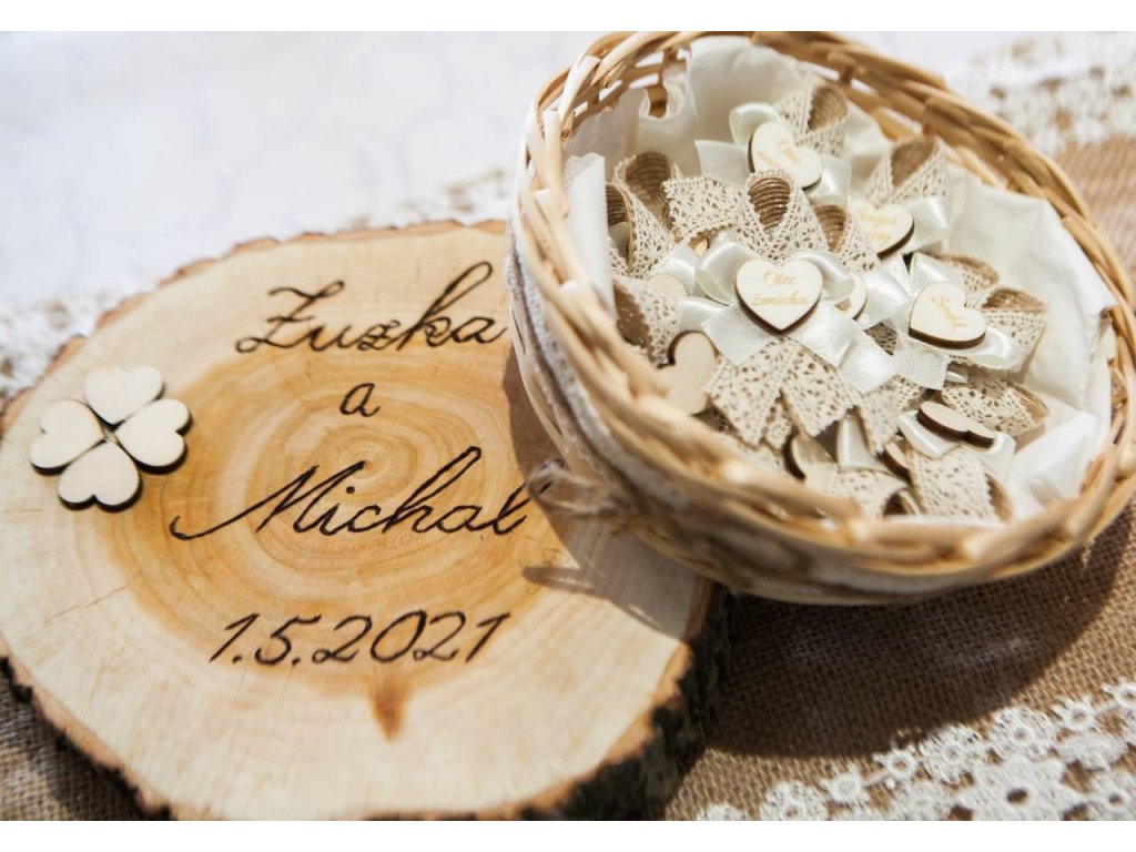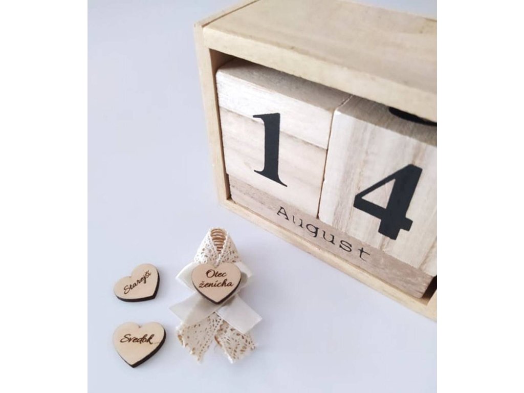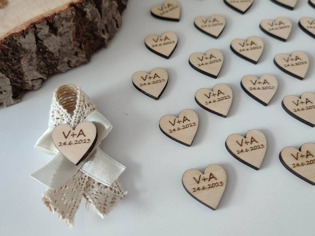 Drevené srdiečka na prizdobenie svadobných pierok pre hostí s vygravírovaným nápisom. Na srdiečko je možné napísať krátky text ako napr. Otec nevesty, Svedok, Najlepší brat, Švagor ženícha, Veselý svadobčan... podľa Vášho želania, prípadne iniciály a dátum svadby.