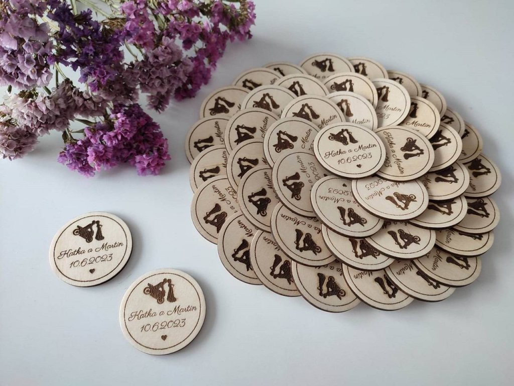 Drevené magnetky pre svadobčanov v tvare kruhu s menami mladomanželov a dátumom svadby sú pekným darčekom, ktorý vždy pripomenie hosťom Váš veľký a ich príjemne strávený deň. Drobnosť, ktorá podčiarkne kúzelnú svadobnú atmosféru a umocní dojem zo svadobnej oslavy.