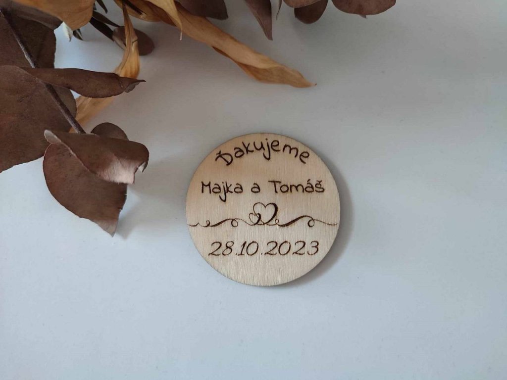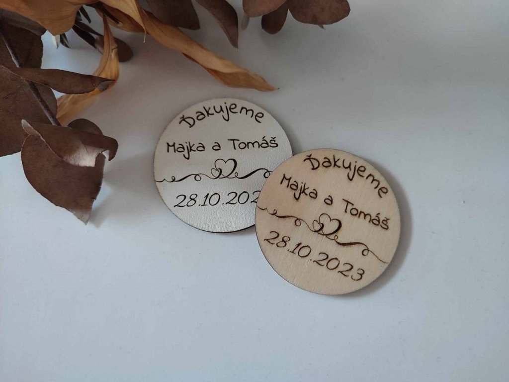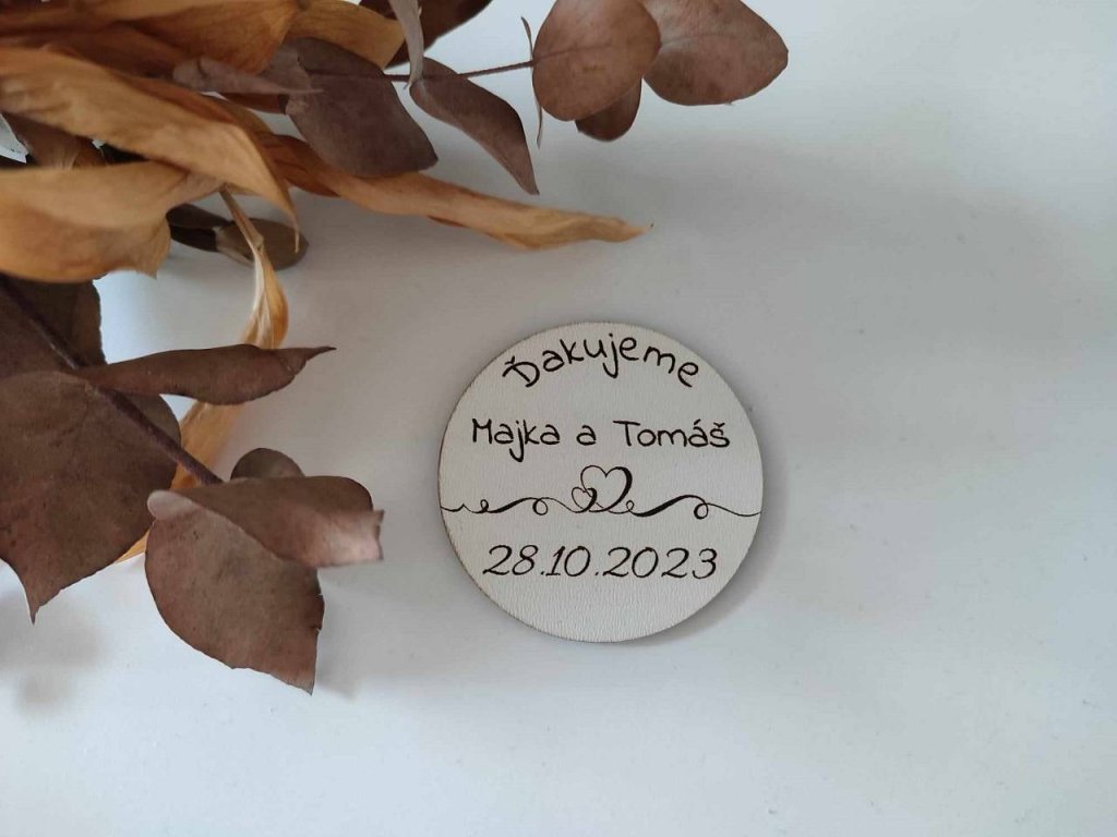 Drevené magnetky pre svadobčanov v tvare kruhu s menami mladomanželov a dátumom svadby sú pekným darčekom, ktorý vždy pripomenie hosťom Váš veľký a ich príjemne strávený deň. Drobnosť, ktorá podčiarkne kúzelnú svadobnú atmosféru a umocní dojem zo svadobnej oslavy.