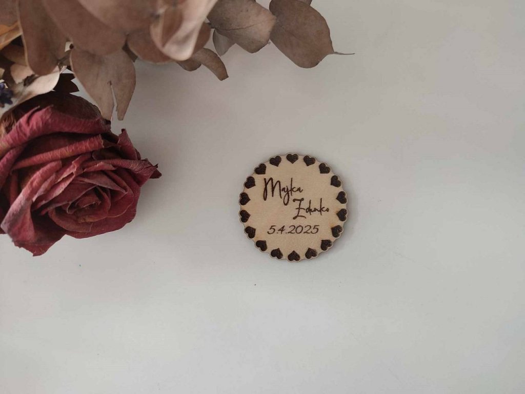 Drevené magnetky pre svadobčanov v tvare kruhu so srdiečkovým lemom s menami mladomanželov a dátumom svadby sú pekným darčekom, ktorý vždy pripomenie hosťom Váš veľký a ich príjemne strávený deň. Drobnosť, ktorá podčiarkne kúzelnú svadobnú atmosféru a umocní dojem zo svadobnej oslavy.