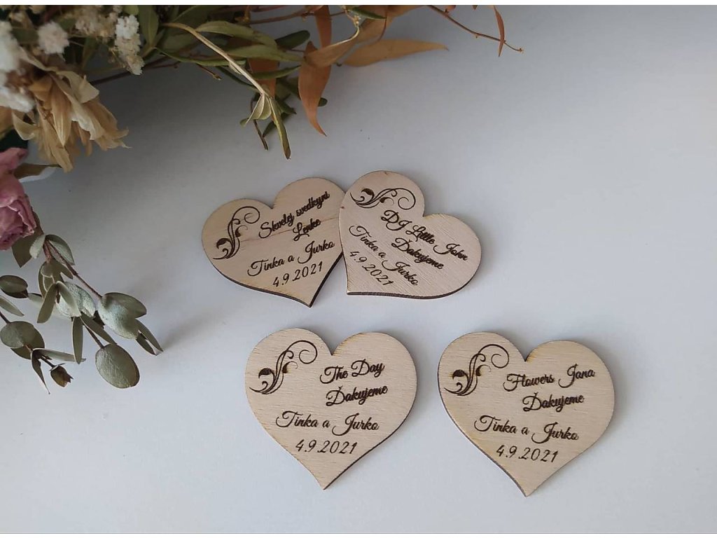 Drevené magnetky pre svadobčanov v tvare srdiečka s menami mladomanželov, dátumom svadby a poďakovaním sú pekným darčekom, ktoré vždy pripomenú hosťom Váš veľký a ich príjemne strávený deň. Drobnosť, ktorá podčiarkne kúzelnú svadobnú atmosféru a umocní dojem zo svadobnej oslavy.