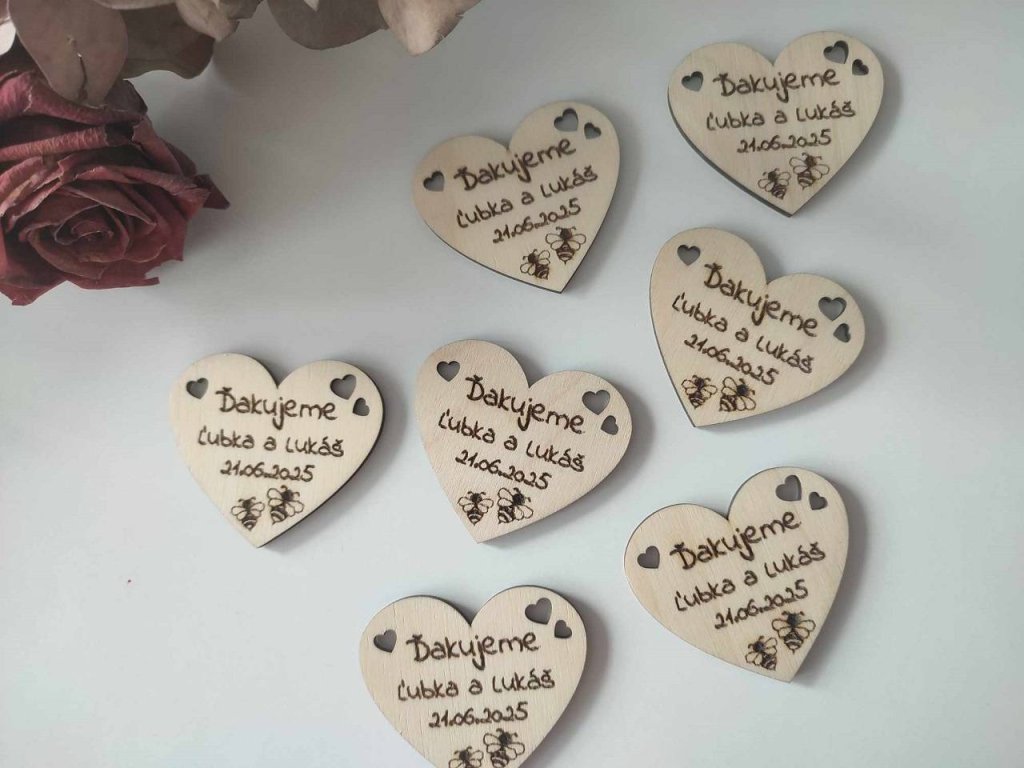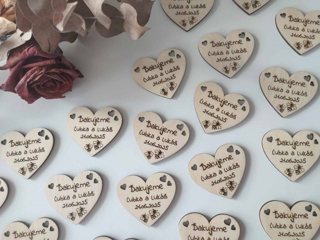 Drevené magnetky pre svadobčanov v tvare srdiečka s menami mladomanželov, dátumom svadby a poďakovaním sú pekným darčekom, ktorý vždy pripomenie hosťom Váš veľký a ich príjemne strávený deň. Drobnosť, ktorá podčiarkne kúzelnú svadobnú atmosféru a umocní dojem zo svadobnej oslavy.