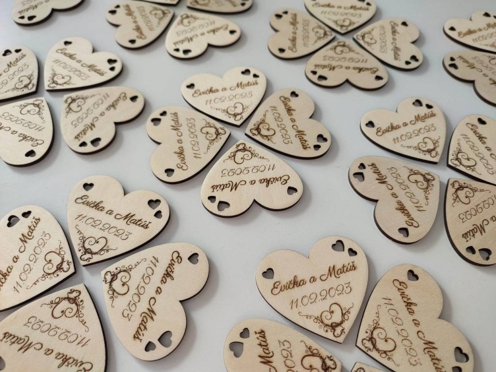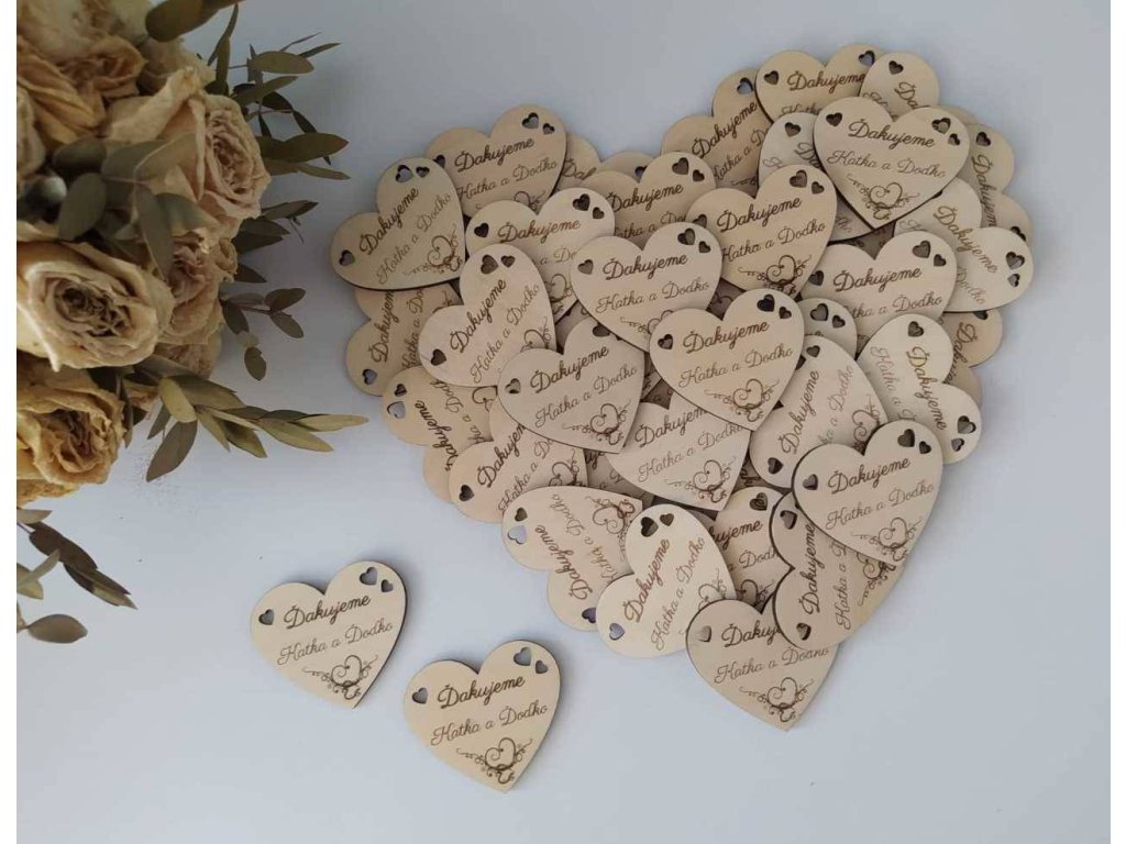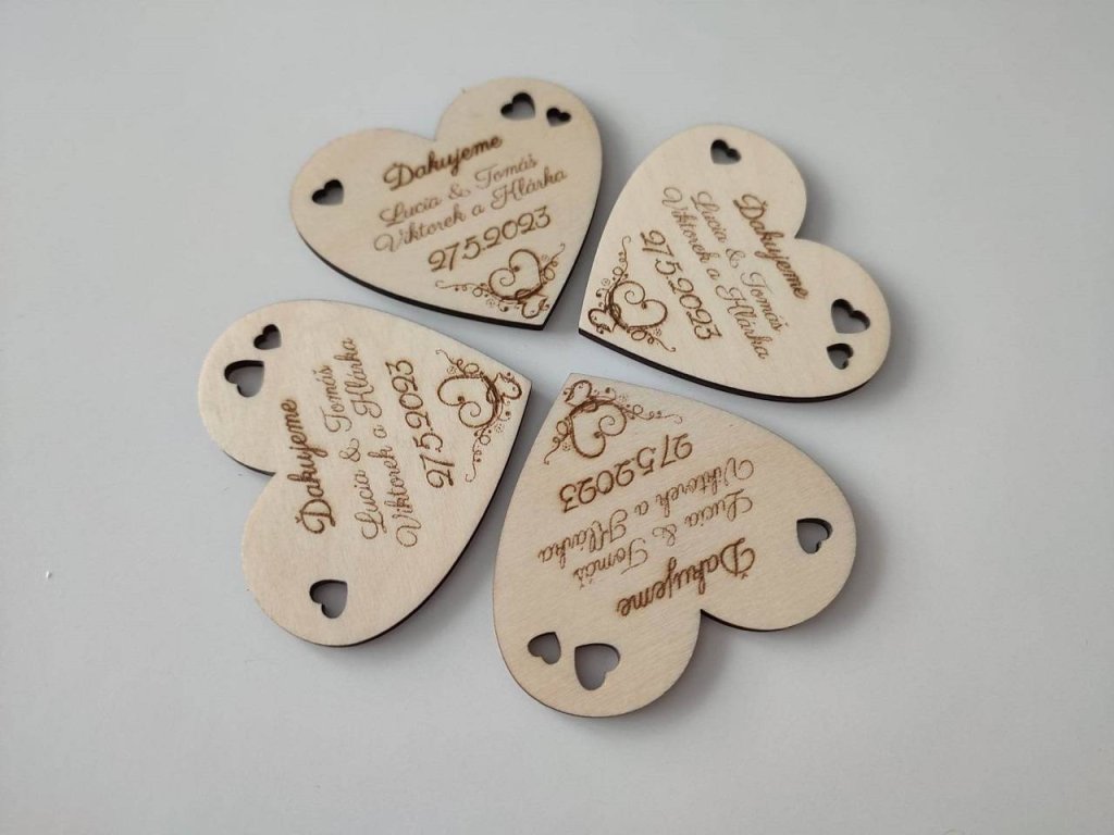 Drevené magnetky pre svadobčanov v tvare srdiečka s menami mladomanželov, dátumom svadby a poďakovaním sú pekným darčekom, ktorý vždy pripomenie hosťom Váš veľký a ich príjemne strávený deň. Drobnosť, ktorá podčiarkne kúzelnú svadobnú atmosféru a umocní dojem zo svadobnej oslavy.