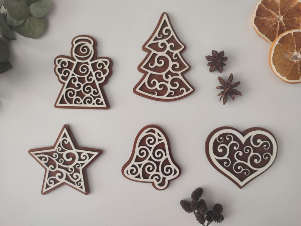 Každý kúsok je starostlivo vyrezávaný a zdobený do detailu. V sade sa nachádza anjel, stromček, hviezda, zvonček a srdiečko. Sady sú dostupné v troch farebných kombináciách, aby si mohol vybrať každý.