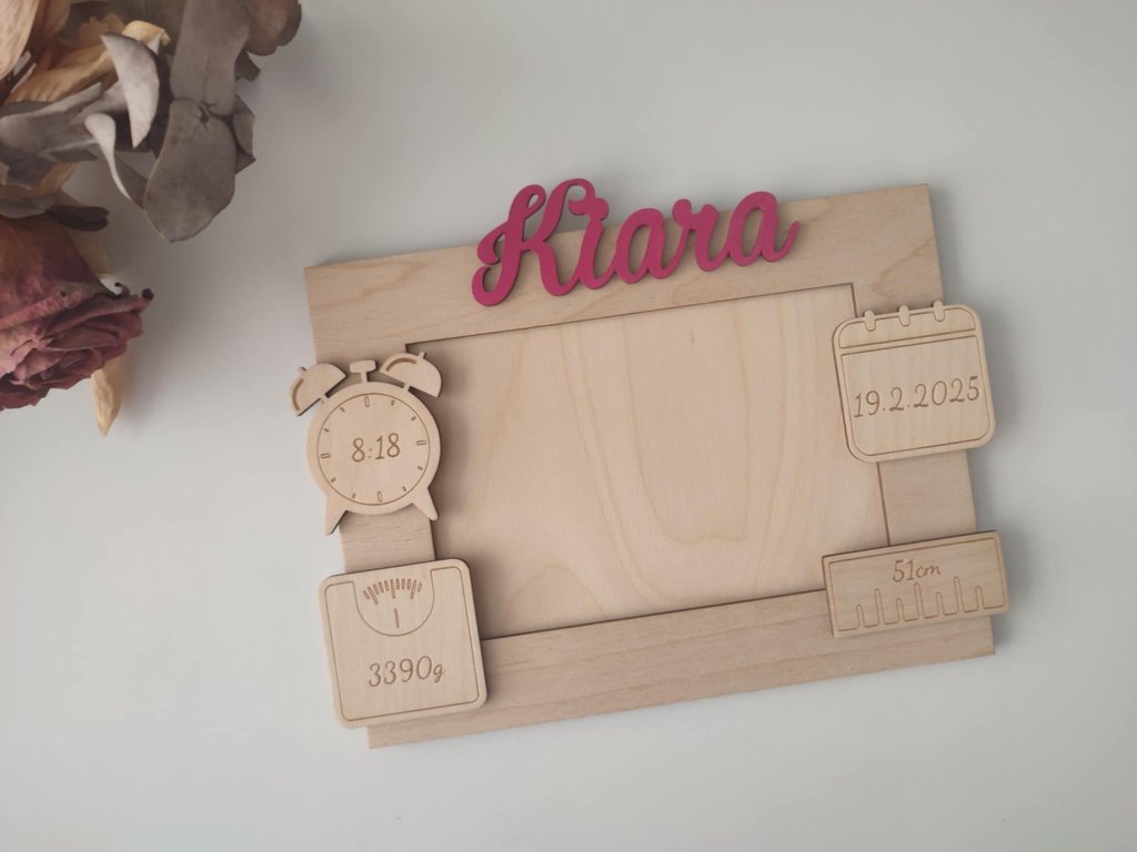 Rámik obsahuje miesto pre fotografiu 10x15 cm, ktorá sa vloží z v vrchnej časti, vyrezávané meno vo farbe podľa želania a ikonky s údajmi o narodení dieťatka ako je dátum, čas, dĺžka a váha. Zo zadnej strany je nožička na samostatné státie. V prípade záujmu je možné vyrobiť s háčikom na zavesenie na stenu.