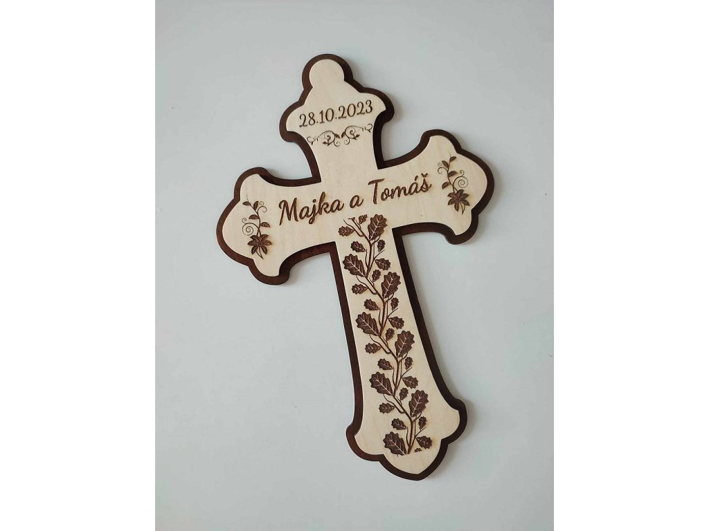Drevený krížik na svadbu s gravírovanými menami, dátumom svadby a ozdobnými ornametami. Krížik je vyrobený z dvoch vrstiev brezovej preglejky o celkovej hrúbke 6 mm - spodná vrstva v prevedení tmavý gaštan a vrchná vrstva s gravírovaním mien novomanželov a dátumu svadby.