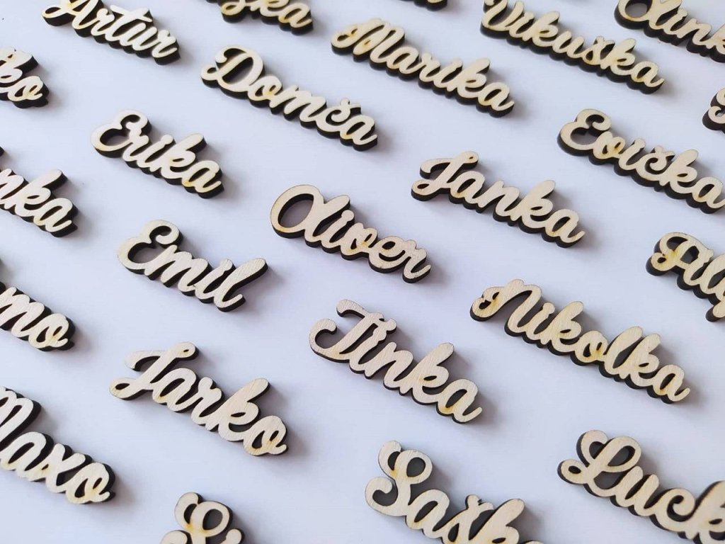 Drevený výrez v podobe mena, ideálny k dozdobeniu dekorácií alebo ako kreatívna menovka. Nápis je vyrezávaný z preglejky hrúbky 3 mm. Šírka mena 5cm, veľkosť závisí od dĺžky mena.
