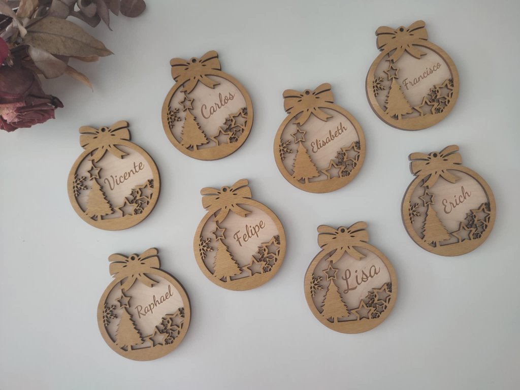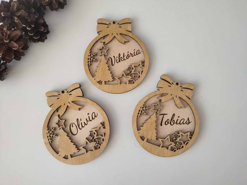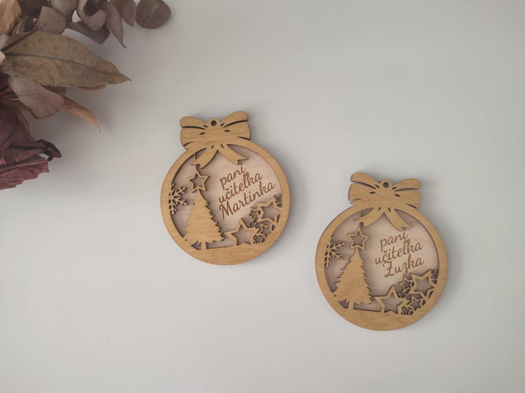 Všetci priaznivci tradičných prírodných dekorácií ocenia naše drevené ozdoby, ktoré rozjasnia Vaše Vianoce. Vykúzlite si doma tú pravú vianočnú náladu a vyzdobte si stromček drevenou guľou s menom alebo vlastným textom. Guľa je zložená z dvoch vrstiev - spodná vrstva v prírodnom prevedení s gravírovaným menom, vrchná vrstva vo farbe svetlý dub.