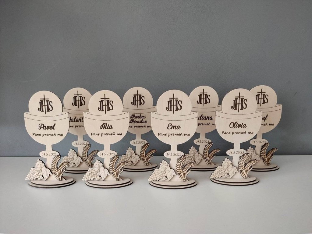 Darček na prvé sväté prijímanie v podobe dreveného kalicha na podstavci s menom a dátumom prijímania. Kalich slúži ako dekorácia a milá spomienka na deň prijatia tejto sviatosti.