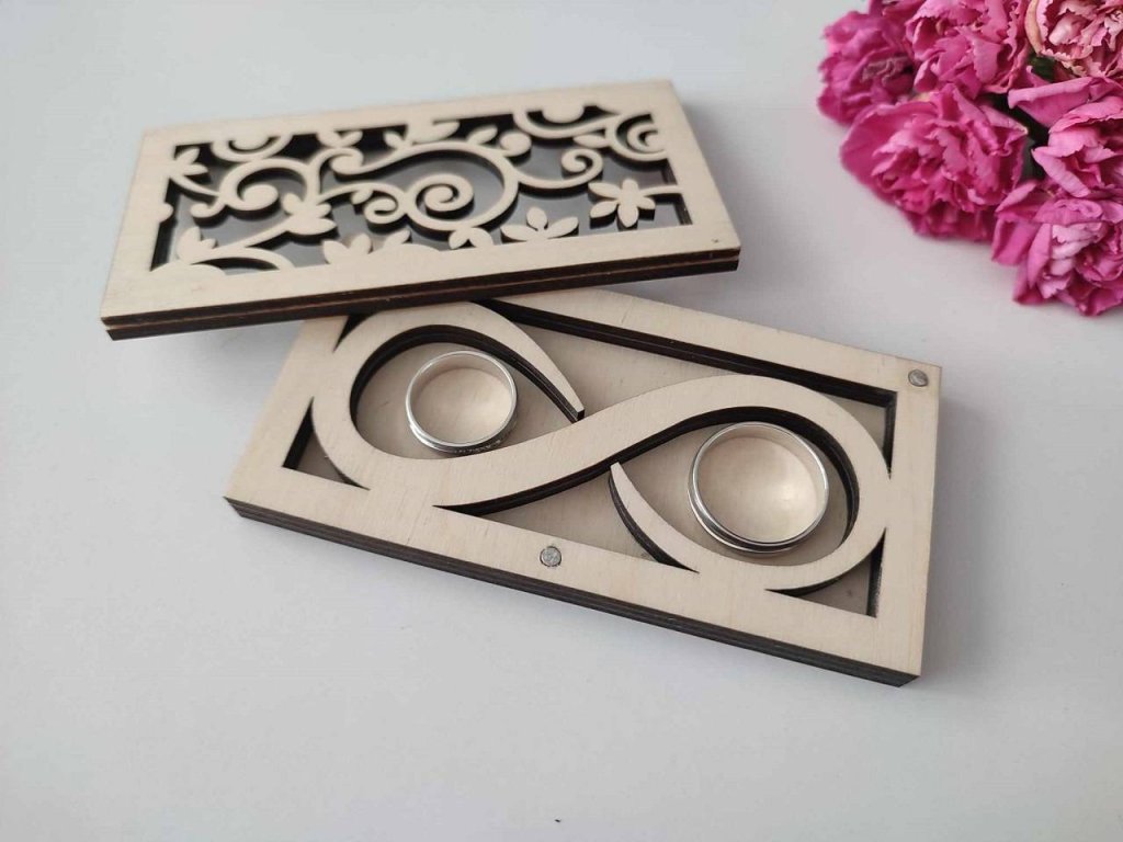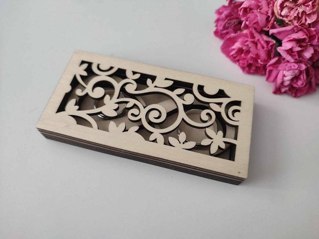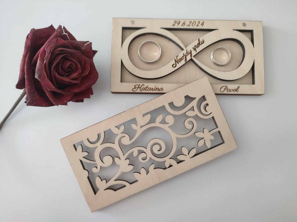 Jedinečná a praktická krabička na svadobné obrúčky s vyrezávaným poklopom je krásnou spomienkou na Váš svadobný deň. Krabička sa uzatvára napevno pomocou magnetov, takže prstienky z nej nevypadnú.