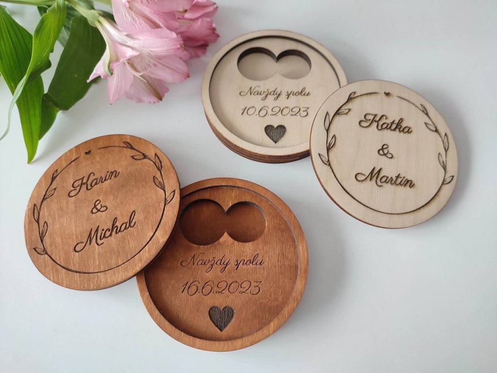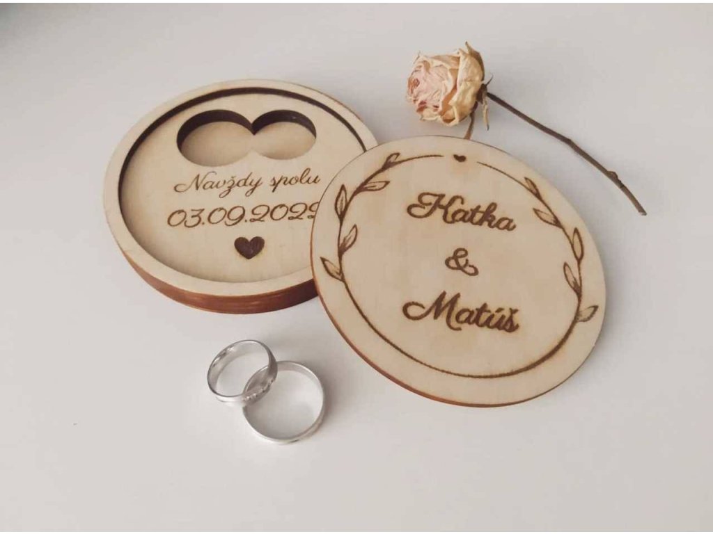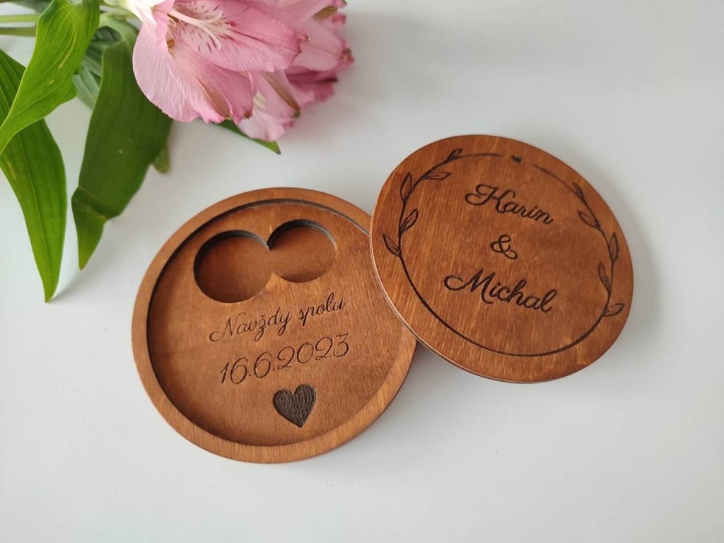 Jedinečná a praktická krabička na svadobné obrúčky s personalizovaným textom je krásnou spomienkou na Váš svadobný deň. V prírodnom alebo tmavom prevedení a vo veľkosti, ktorá sa zmestí do vrecka.
