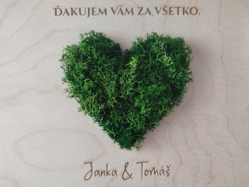 Machové srdce, ktoré povie ĎAKUJEM. Potešiť sa dá nielen kvetmi, ale napríklad aj takýmto milým poďakovaním so srdiečkom zo stabilizovaného machu, ktoré zaručene vyčarí úsmev na tvári. Krásny a dojímavý dar pre rodičov, ako poďakovanie plné lásky a vďaky, ktoré bude krásnou spomienkou.